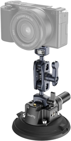 Ten aluminiowy uchwyt na przyssawkę od SmallRig umożliwia stabilne mocowanie aparatów i kamer w trakcie filmowania w pojeździe lub w pomieszczeniach. Wyposażony w otwory 1/4"-20, 3/8"-16 oraz ARRI 3/8"-16, jest kompatybilny z szeroką gamą akcesoriów SmallRig, w tym modelami 3757, 3873, 3874, 2906, 2070 i 2115.